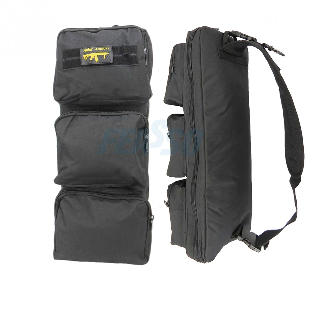 Fabricada em Nylon 600d de altíssima resistência, conta com 3 bolsos grandes do lado externo. O bolso maior fica responsável por armazenar o equipamento (arma).